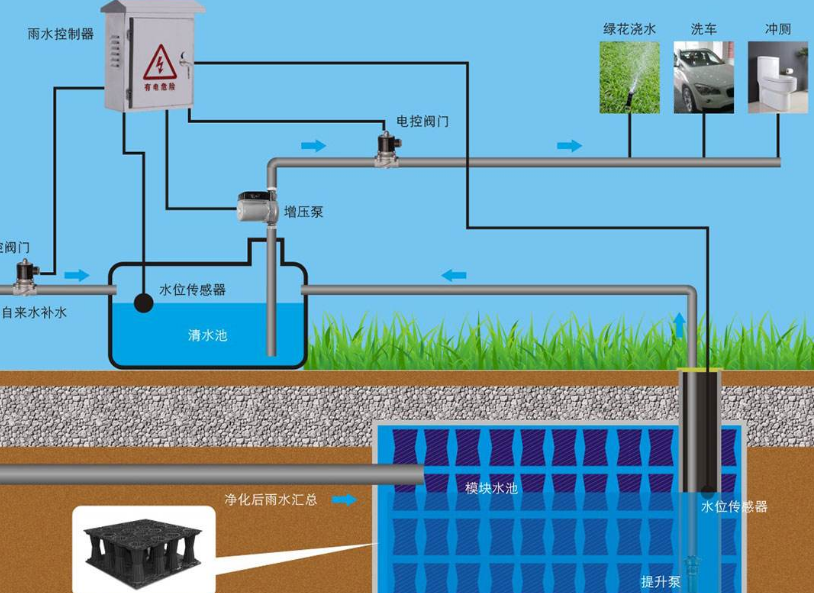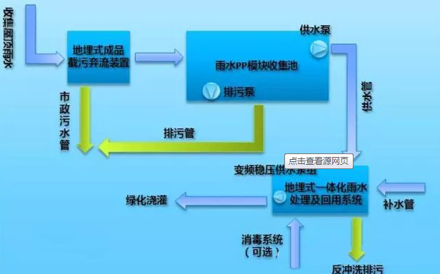 通過(guò)城市建筑屋面、道路、硬質(zhì)鋪裝地面等不透水免收集雨水,通過(guò)接駁市政雨水管網(wǎng),引流收集的雨水進(jìn)入雨水回用系統(tǒng),儲(chǔ)存收集的雨水.